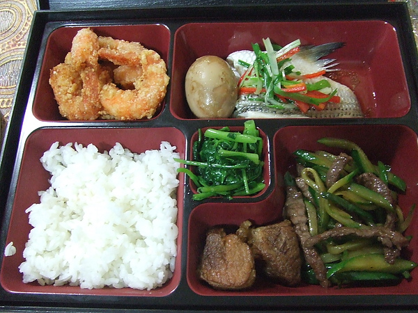 今日菜單:塩酥溪蝦、小黃瓜炒牛肉、炒空心菜、紅燒肉、滷蛋、清蒸銀花鱸