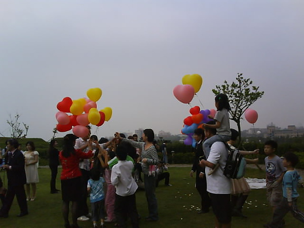 施放58顆心型的汽球。代表他們是在5/8完婚的新人。女兒和兒子也很認真的去等著拿汽球再一起施放到空中。