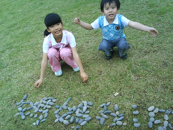 我因為身體不是很舒服,所以找了張椅子坐,遠遠的看著女兒跟兒子在玩.看著他們一直拿著鵝卵石在玩也沒多想.結果他們用石頭排成"媽媽我愛你"讓我好感動,問他們為什麼"愛"不是排愛心形狀而是排成英文字母的"I"他們說我們有特別挑心形的石頭來排的哦!這就是我二個貼心的寶貝。